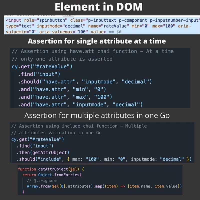 But I wanted to validate multiple attributes in one go. As we know, then() method of cypress accepts function as parameter and we can write a new function to return an object(jquery attributes return namenodemap by default and we need to convert it to an object)