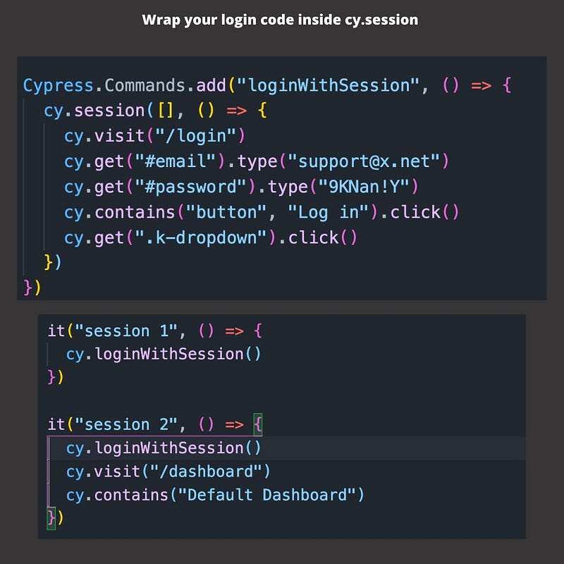 Say you have multiple tests where you need to login every time before performing next set of tests, in this case you can wrap your login code inside cy.session function so that cookies and local storage are cached in the cypress session and same is reused.