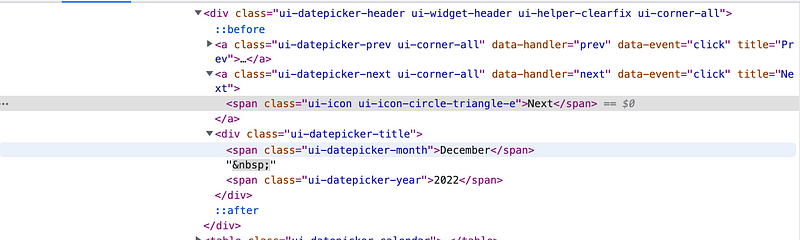We have the Next icon, where we can navigate to next month and also we can get current Month from class ui-datepicker-month. So our cypress test now need to go in a loop where it first need to check the current month, if current month is not the one we want, it should navigate to the next month and then select the date.
