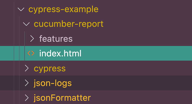 Now if we execute our cypress cucumber features, the HTML report will be generated in the root directory of the project with name cucumber-report.html