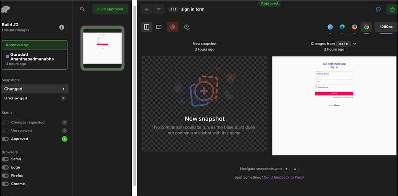 When we execute this test, the first-time snapshot build will be sent to Percy, and we need to approve it. Which will then become the baseline image for future comparison.