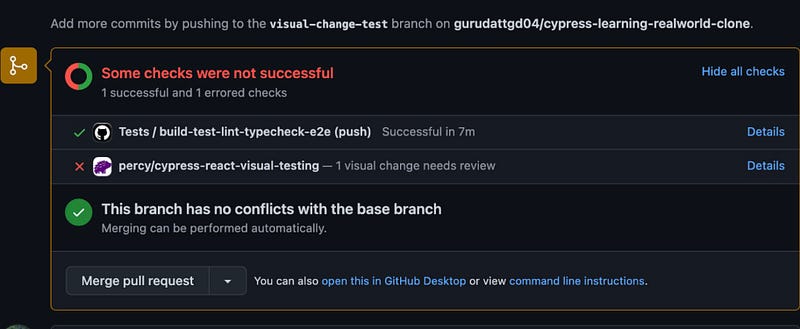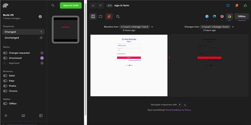 If any change in the feature branch does not match the baseline image, our Percy test will fail, and Percy will highlight the changes, which we can Approve or Request for change.